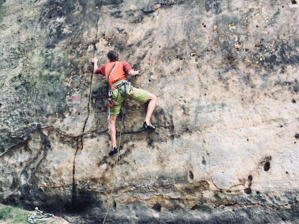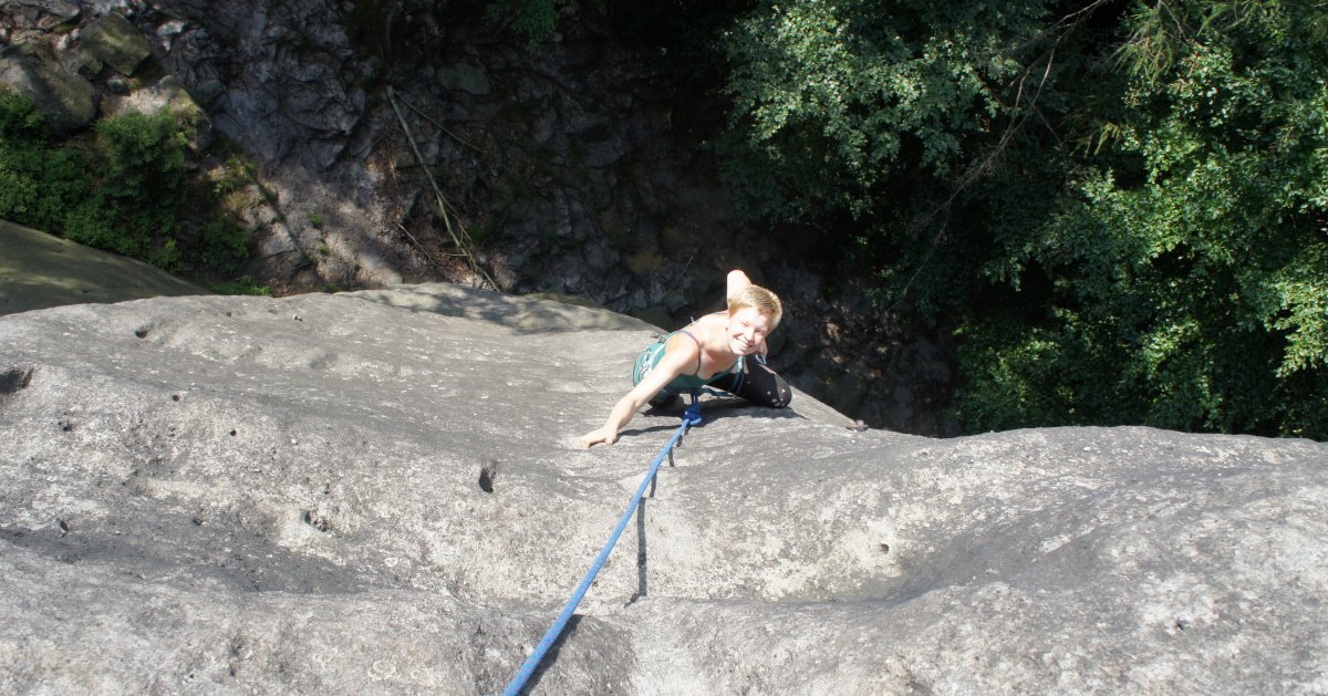 Až budeš s Oskarem hotov, alou do dalších cest! Osmdesátimetrový Falkenstein jich nabízí kolem sto padesáti, takže co třeba takový Südriss za VIIa? Majestátní spára protínající jižní stěnu je saskou legendou. Leze se na začátku jemným traverzem k trhlině, pár žab, pádlování po talířích a jako třešinka na dortu dolez třicetimetrovým komínkem. Tři kruhy, nádhera!