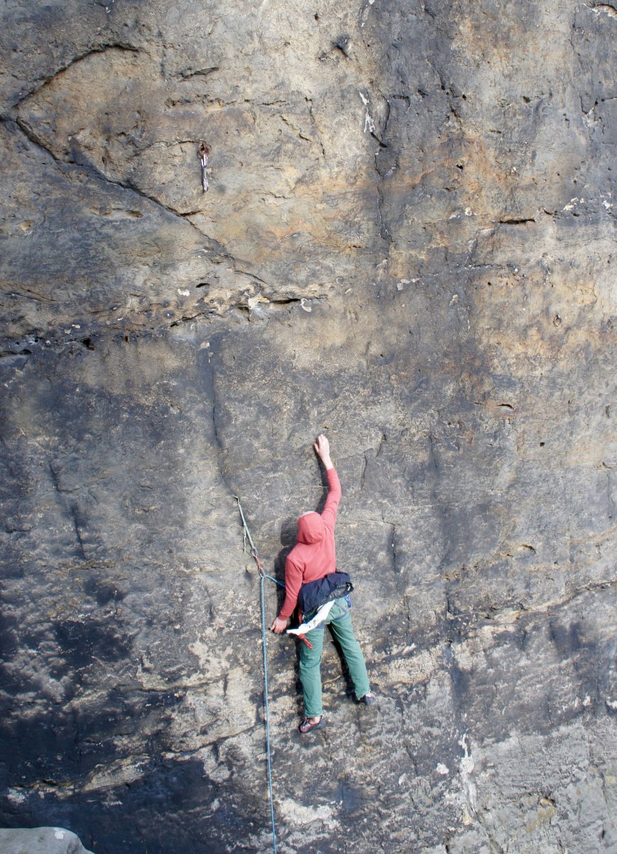 Pokud chceš ještě trochu přitvrdit, dej si přímou variantu s poněkud nečekaným názvem Direkte Westkante RP VIIIb od (rovněž) legendárního Herberta Richtera. Cesta nastupuje ve spádnici horní hrany. Překrokem z kamene se dostaneš do mírně převislé stěnky, která se později změní v hranu a ještě později v perfektní žábovici. Problémem je, že po pár prvních tempech by se na kámen už blbě vracelo. Kámen sice leží v perfektním pískovišti, do kterého by skákání bylo jedna radost, jenže přímo pod tebou je pořád ten kámen. Takže vzhůru. V převislé stěnce jsou prý někde schované hodinky, jenže se blbě hledají a do toho ti natýká. Jedinou možností je prozaický únik ke kruhu, který je v nějakých 8 metrech. Od něj už méně vyhroceně hrankou s dalším kruhem a pár tempy ve spáře na velkou polici, kde de facto začíná originální cesta, která pro tebe bude po přelezení přímé varianty už jen něco jako příjemná projížďka na kole.