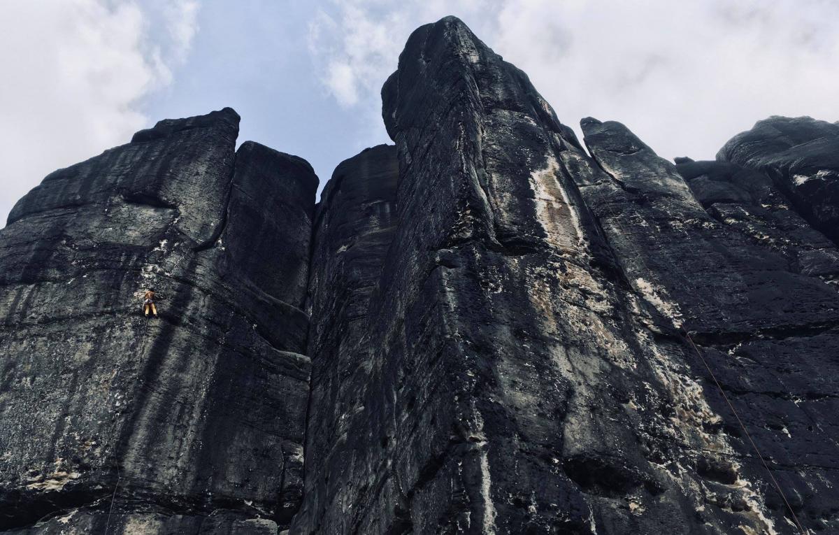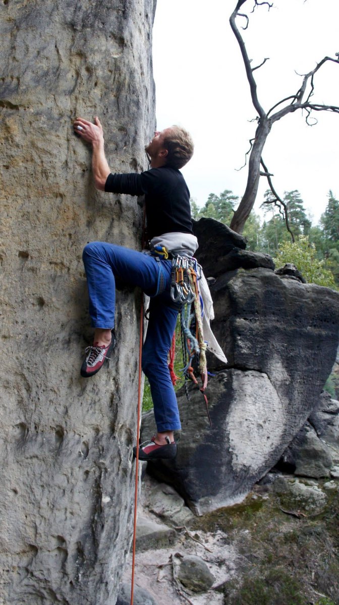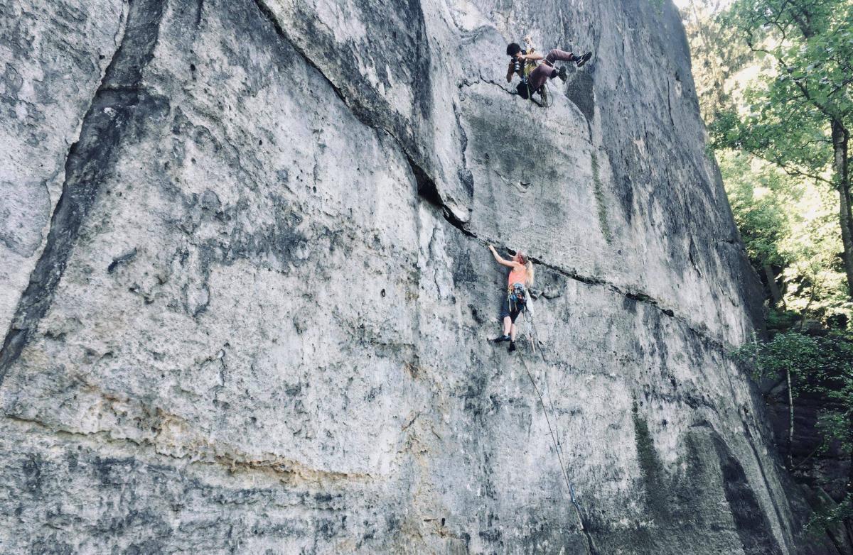 Pro zklidnění bychom si mohli dát nějakou devítku sportovnějšiho ražení, protože sportovek (ehm, v uvozovkách) je v Sasku, světe div se, taky dost. Na teplé dny je skvělá třeba Das muss kesseln RP IXb v elegantní úzké východní stěně rathenské Amselspitze. Postačí pět expresek do kruhů a pár smyček a karabin na dolez cestou Rengerweg VIIc, která je mimochodem taky nádherná!