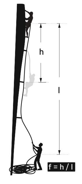 1. Der Sturzfaktor "f" ist eine dimensionslose Größe, die das Verhältnis zwischen der Fallhöhe H und der Länge des ausgegebenen Seils angibt – der Länge des Seils, das die Fallenergie L aufnimmt. Es gilt, dass: f = H/L. Es wird empfohlen, das Material nach einem schweren Sturz auszurangieren. Ein schwerer Sturz ist ein Sturz mit einem Sturzfaktor größer als 1. Aber es kommt auch sehr auf die Sicherungsmethode an. Die Belastung des Klettermaterials ist unterschiedlich, wenn der Sicherer "hart" und wenn er "dynamisch" sichert. Eine angemessene dynamische Sicherung ist natürlich schonender für den Kletterer und das Material.